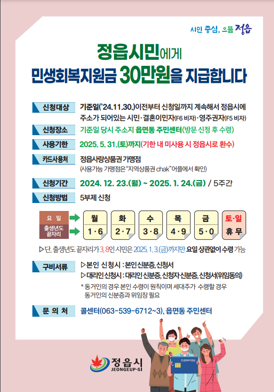 2024년 11월 30일 이전부터 신청일까지 계속하여 정읍시에 주민등록이 되어 있는 시민 결혼 이민자 및 영주권자 포함 (주민등록 말소자, 외국인 등록만 된 외국인은 제외)